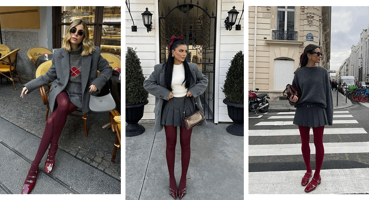 Еще один тренд этой осени — плотные бордовые колготки. Они отлично сочетаются с черной и серой одеждой, а также могут вписаться в образ в оттенках бежевого. Используй акцентные колготки, чтобы создать стильный и женственный аутфит с мини-юбкой. Присмотрись к модели в гармошку: она выглядит эффектно и не так стесняет движения, как обтягивающие юбки. Также советуем обратить внимание на бордовую обувь: балетки, кеды или ботинки. Это поможет визуально удлинить ноги и сохранить цветовой баланс.