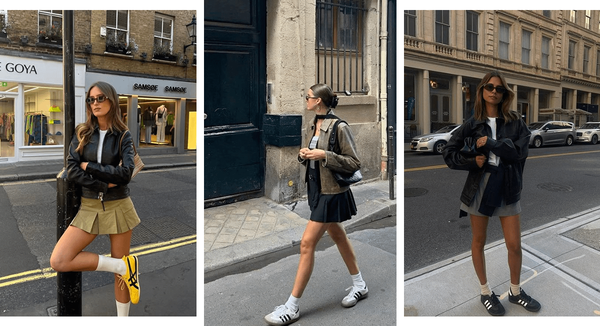 Мини-юбка и так подчеркнет красоту твоих ног, поэтому от обуви на высоких каблуках можно отказаться. Особенно если переживаешь, что кому-то твой образ покажется вызывающим. Замени туфли базовыми кедами и дополни наряд высокими однотонными носками. Заверши лук актуальной этой осенью кожаной курткой с отложным воротником и тонким ярким шарфом.