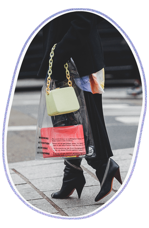 Если и у тебя подобный модный эксперимент вызывает интерес, выбирай сумки разных размеров: одна из них будет выполнять функцию чисто эстетическую, а другая практическую. В тренде как классические сумки, так и более «сложные» модели: прозрачные, тканевые, форменные, из необычных материалов.