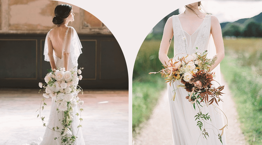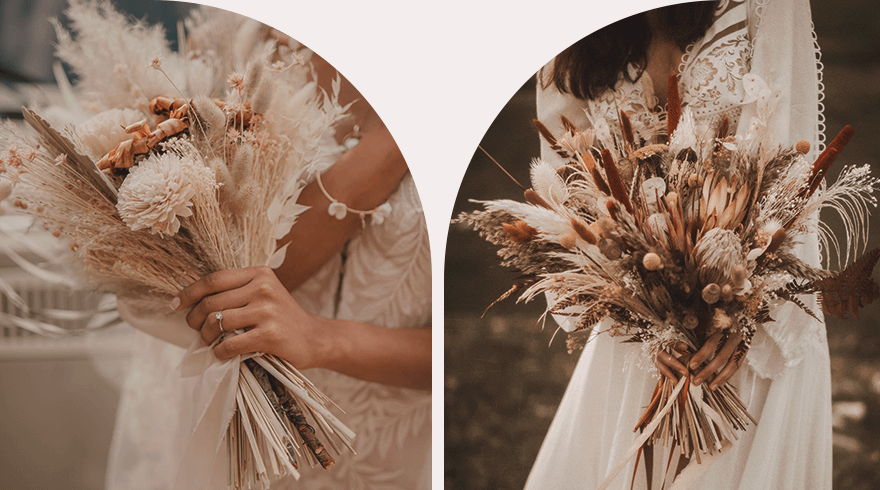 Чаще всего для изготовления свадебных букетов используют лаванду, протею, хлопок, листья эвкалипта, кермек. Гармонично такие букеты сочетаются с нежными ажурными платьями или моделями в стиле бохо. О том, какие фасоны свадебных платьев актуальны в этом году, мы рассказывали здесь.