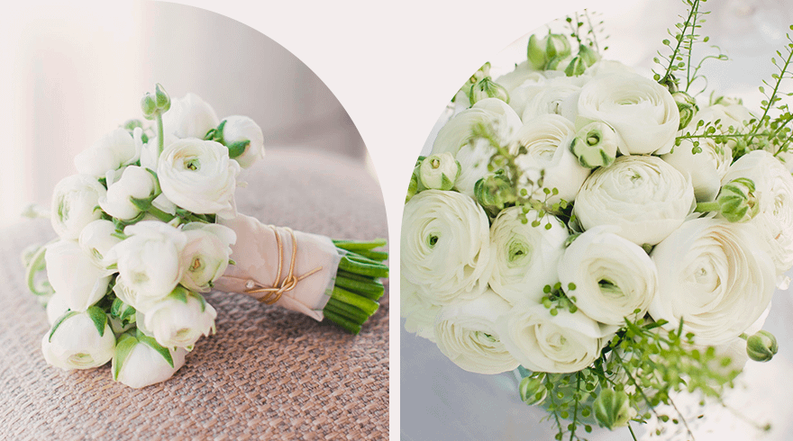 В последнее время свадебные композиции, составленные из этих цветов, пользуются большой популярностью. Букеты из ранункулюса могут иметь либо классическую круглую форму, либо слегка вытянутую. Сочетают эти цветы чаще всего в одной композиции с веточками эвкалипта.