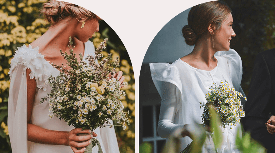 Чтобы свадебный образ получился гармоничным, дополнить его можно либо венком, либо прической также украшенной живыми полевыми цветами. Платье к такому образу лучше подбирать лаконичное, но при этом с необычным акцентом. Например, воротником-стойкой, широкими рукавами или длинной фатой.