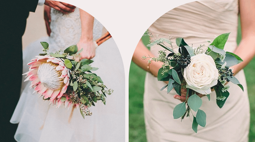 Оригинальная замена классического пышного свадебного букета — композиция, составленная из одного цветка. Чаще всего флористы используют крупный цветок, например, хризантему, герберу или пион. Пышная роза или экзотический цветок, дополненные небольшим количеством зелени, также выглядят необычно.