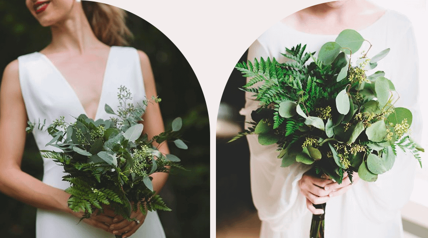 Зеленые свадебные букеты, основу которых составляют листья, зелень и нераспущенные бутоны также актуальны в этом сезоне. Такие композиции — идеальный вариант для ценителей минимализма и естественности. Как правило, собирают зеленые букеты из папоротника, веточек эвкалипта, фистации, рускуса и самшита.
