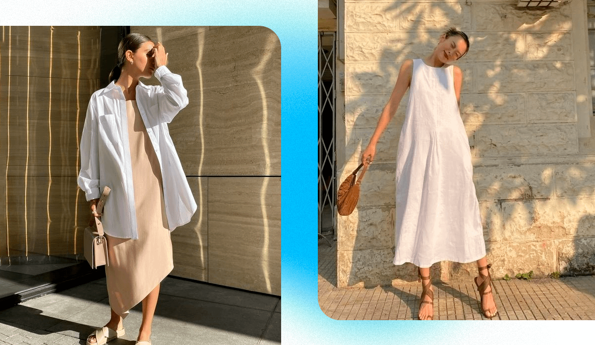 Выбери платье миди лаконичного кроя, если хочешь вписать его в капсульный летний гардероб. Присмотрись к моделям в светлых оттенках: бежевом, голубом, сером, розовом. В прохладные вечера поверх платья можешь надеть рубашку или свитер — так образ получится еще более милым.