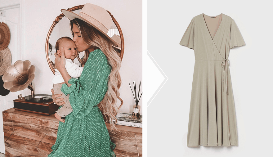 При выборе платья обрати внимание на модели с запахом. Они удобны, если ты кормишь грудью, а еще скрывают некоторые нюансы фигуры после родов. К тому же они сейчас в моде — ты можешь выбрать однотонное платье, с принтом и декором или более строгое разной длины.