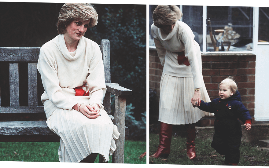 Это фото сделано в излюбленном месте Дианы — Кенсингтонском саду в декабре 1983 года. Нежный монохромный образ — белый свитер с объемным горлом и белая юбка-гофре длины миди — Диана оживила красными лаковыми сапогами и таким же поясом. Всего пара деталей создают наряду совершенно новое настроение.