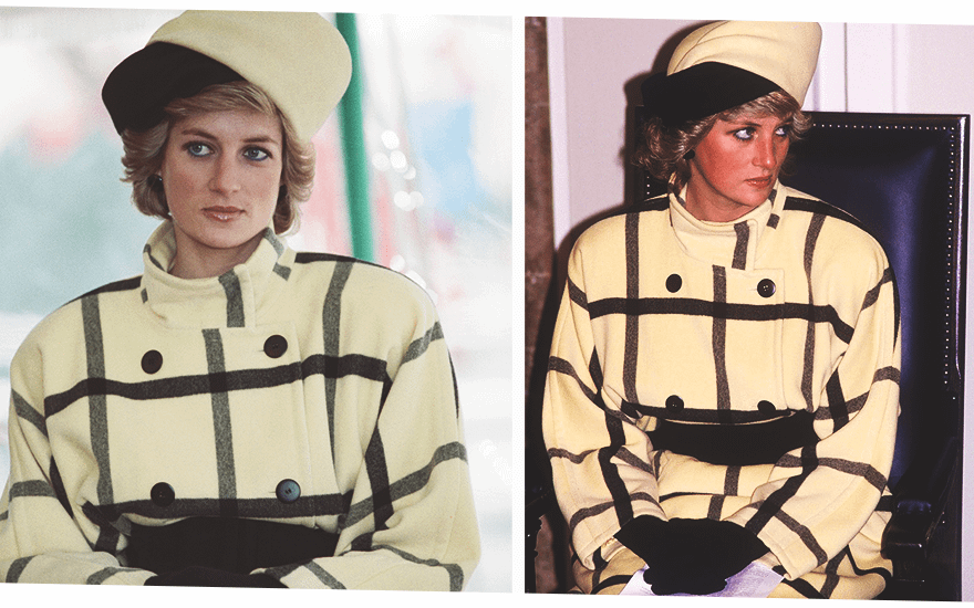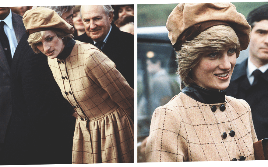 Такой монохромный образ идеально впишется в современные тренды. Объемный бежевый берет и пальто в тон с клетчатым принтом и классическими пуговицами – наряд, ставший воплощением европейского шика. В нем Диана появилась во время визита в Уэльс в ноябре 1982 года.