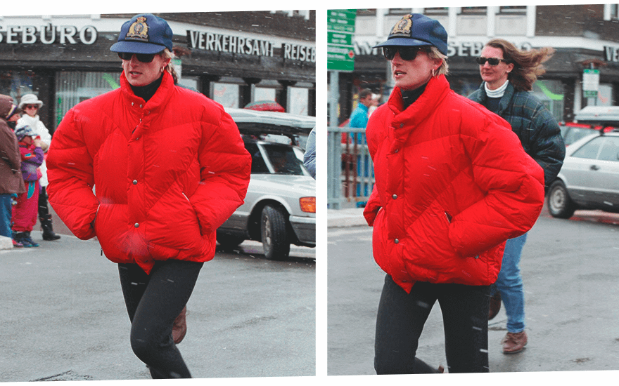 После расставания с принцем Чарльзом Диана не боится рисковать со стилем. Если раньше ее образы были менее сдержанными, чем положено королевской персоне, то после выхода из состава семьи они могли быть экстремальными. Наш любимый пример – объемная алая куртка, леггинсы, темные очки и синяя бейсболка с принтом, в которых Диана разгуливала на отдыхе в Австрии в 1994 году. Этот образ абсолютно актуален сегодня, когда все — от масс-маркета до люксовых брендов — выпускают оверсайз пуховики и куртки.