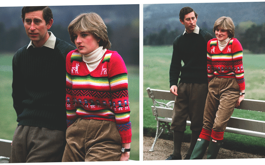 Этот образ, явно случайно подобранный, стал одним из ярких моментов в моде принцессы Дианы. Фото Дианы с принцем Чарльзом было сделано в поместье Балморал в 1981 году после объявления о помолвке пары.