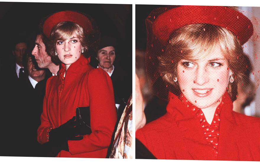 Во время посещения Гилдфордского собора в канун Рождества 1981 года принцесса Диана выглядела очень празднично. Ярко-красное пальто, шляпка и даже вуаль в тон. Дополняли образ черные перчатки и черный клатч.