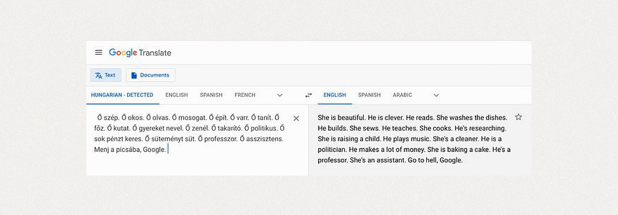 Старшая преподавательница из Эксетерского университета заметила, что Google Translate допускает сексизм при переводе текстов с гендерно-нейтральных языков. Например, в венгерском, если речь идет о домашних делах, сервис переводит гендерно-нейтральное местоимение как «она». А когда говорится об интеллектуальных достижениях — «он».
