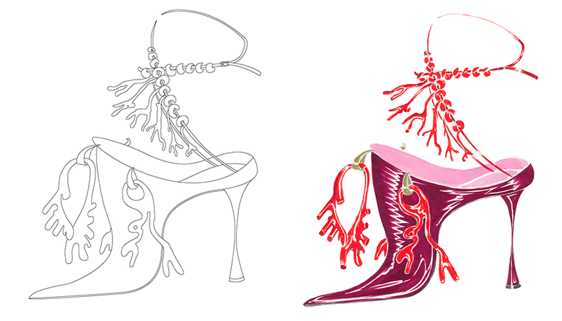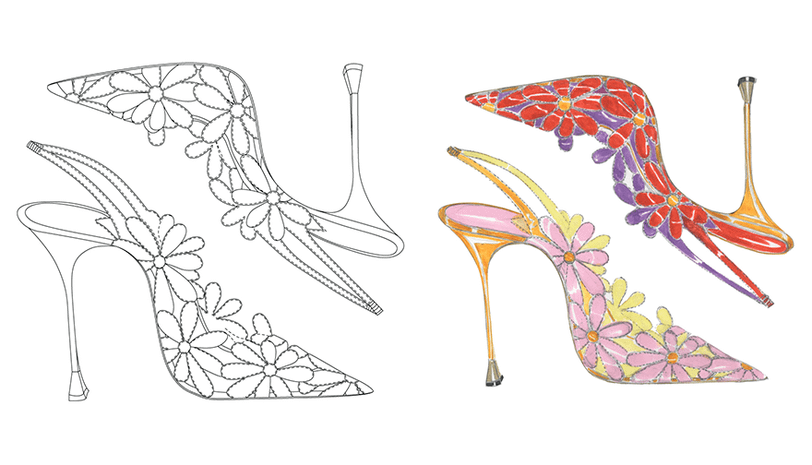 Онлайн-раскраска состоит из пяти эскизов туфель из разных коллекций. Любой из них можно скачать на официальном сайте Manolo Blahnik, распечатать и раскрасить так, как тебе хочется. Получившимся результатом можно поделиться в Инстаграме под хештегом #ManoloBlahnikSmiles.