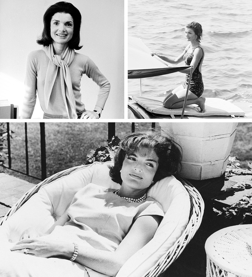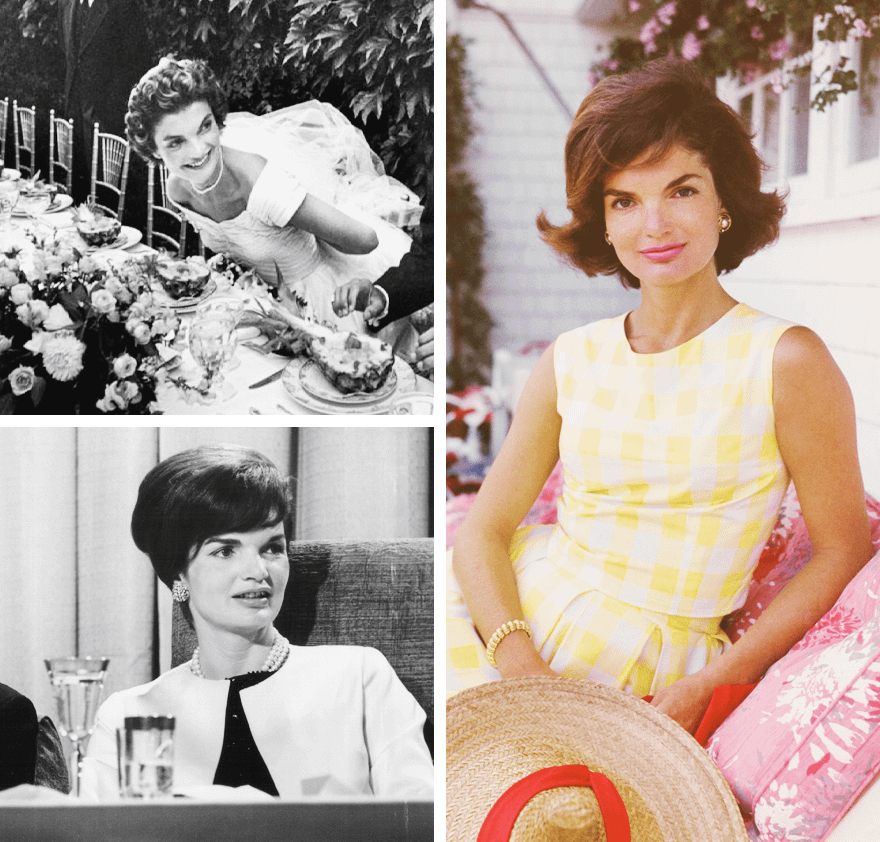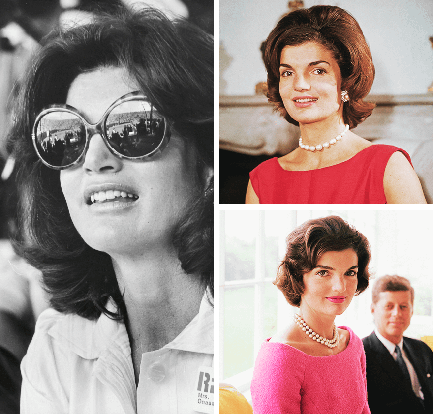 Здесь Жаклин доверяла себе. Известно, что женщина оставалась приверженкой легкого макияжа, но не могла обойти стороной яркие помады — особенно красного и розового оттенков. Она же задолго до Брук Шилдс и Кары Делевинь сделала трендом пышные брови — такого эффекта первая леди добивалась за счет моделирующего карандаша. Иногда Жаклин позволяла себе выйти в свет без мейкапа. Здесь ей на выручку приходили массивные солнцезащитные очки и цветастые платки для головы. Дополняла свой образ Джеки неизменным парфюмом — ее фаворитом оставался Lovely Patchouli 55 от House of Krigler.