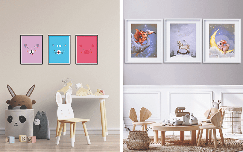 Постер или серия постеров — самое популярное решение оформления детской комнаты. Яркие и запоминающиеся картинки в простых рамах не только позволяют разнообразить однотонные стены, но и создают в помещении художественную атмосферу. Выбери вместе с ребенком то, что ему по душе: это могут быть забавные животные, урбанистические и природные пейзажи, автотранспорт или просто рандомные изображения, объединенные одной цветовой гаммой. Кстати, постеры можно смело комбинировать с семейными фотографиями и собственными рисунками ребенка. Подумайте, как разместить выбранные картинки: гораздо интереснее, когда они висят на разных уровнях. Выберите самое крупное изображение в качестве центрального элемента, а затем в хаотичном порядке развесьте все остальное. Результат получится весьма эффектный, кроме того, дети любят такие эксперименты.