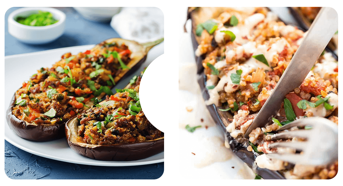 Наполни «лодочки» из баклажанов приготовленной смесью, уложи их на противень и запекай 20–25 минут в духовке до мягкости.