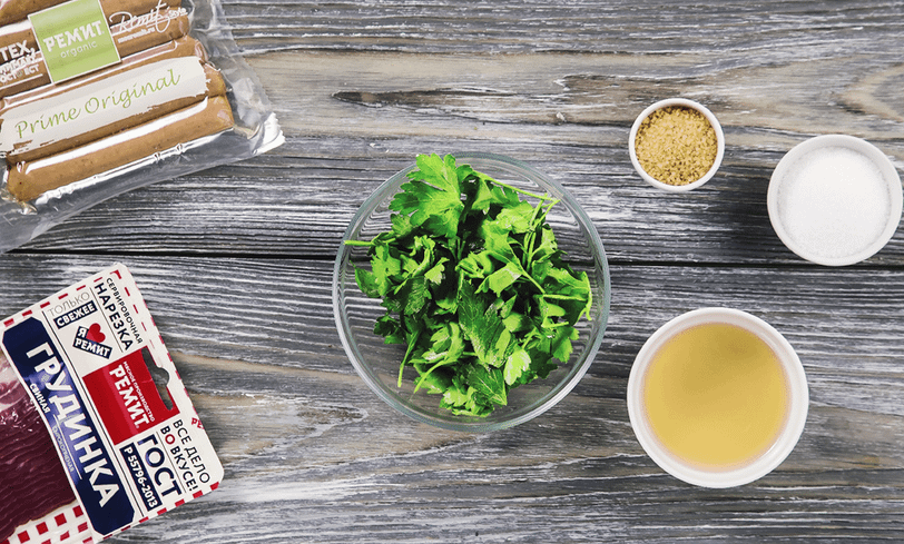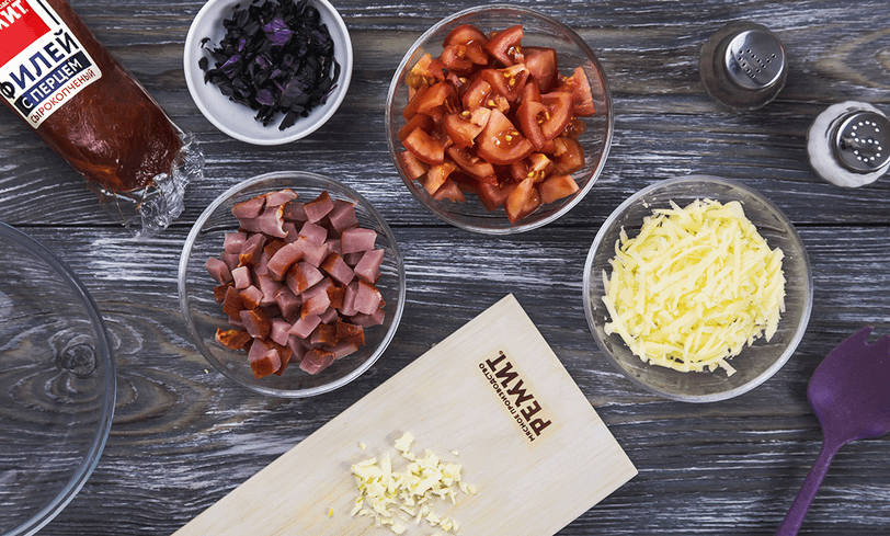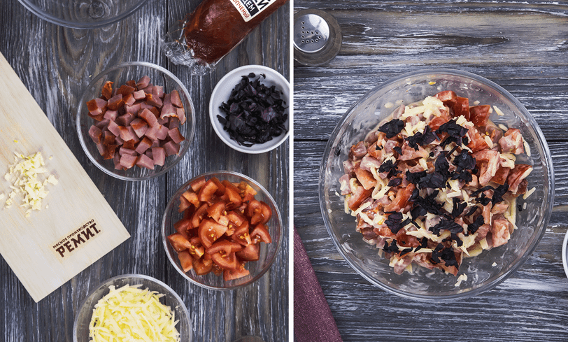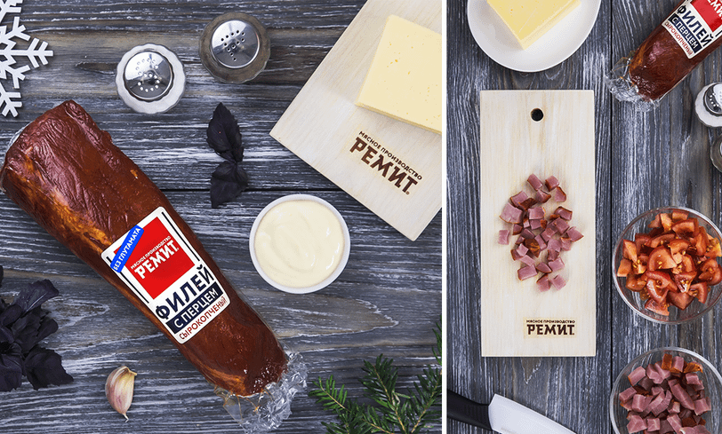 Аккуратные кусочки вкусного филея «РЕМИТ» формируют основу этого пикантного салата, а сыр гауда, долька чеснока и спелые помидоры завершают этот кулинарный шедевр.