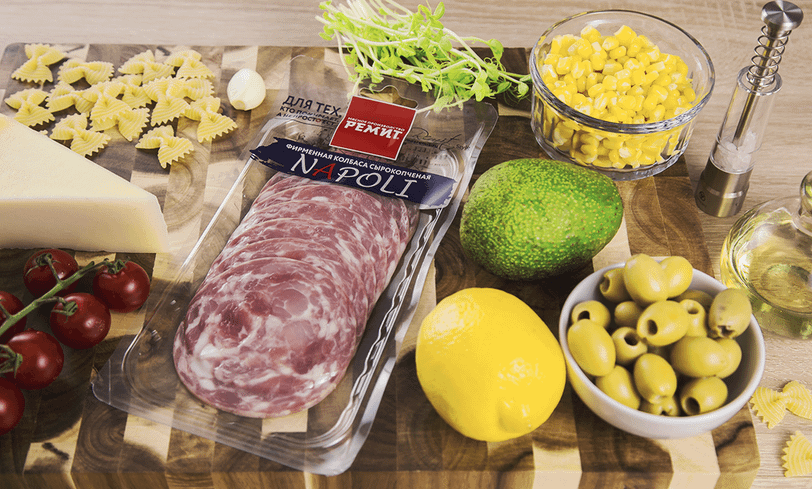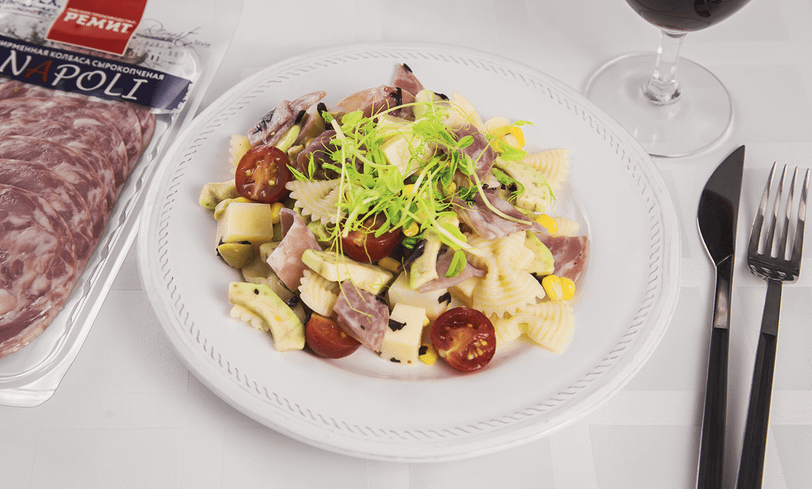 5. Салат из макарон-бантиков с сырокопченой колбасой Napoli «РЕМИТ»