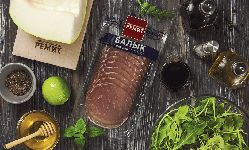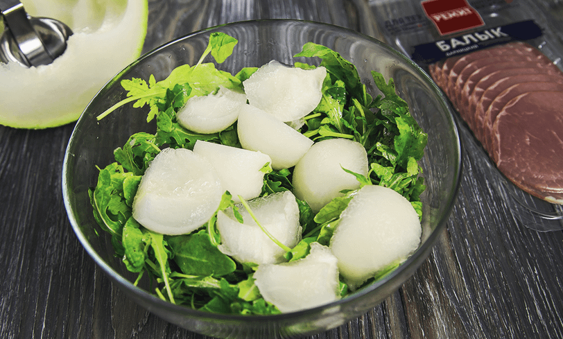 Сырокопченое мясо, медовая дыня и пряная руккола — необычное, но очень яркое и незабываемое сочетание вкусов. Бальзамический уксус и гранатовый соус придают ему кисло-сладкие ноты, а сок лайма — легкий аромат цитрусов.