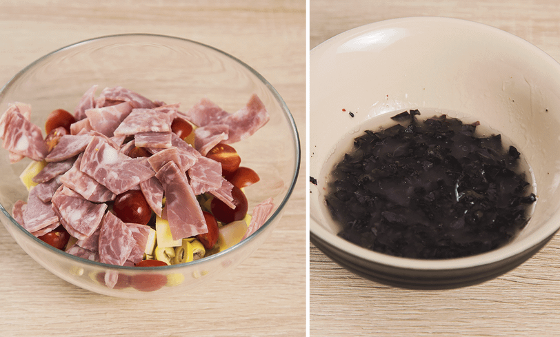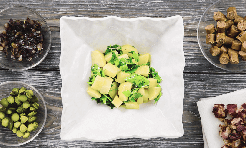 Приготовление: Смешай измельченную петрушку, соль, сахар и винный уксус. Мелко нарежь маринованные огурцы и отставь в сторону. Грудинку нарежь полосками, обжарь до золотистой корочки и выложи на салфетку, чтобы удалить жир. В оставшемся от грудинки жире обжарь колбаски и мелко нарезанный лук. Добавь их в винный уксус со специями и петрушкой. Сосиски нарежь ломтиками, а картофель – кубиками, перемешай с остальными ингредиентами.