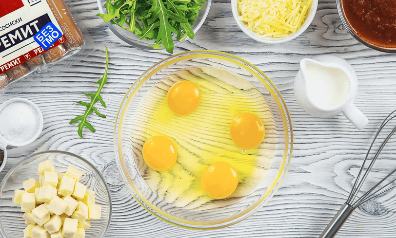 Приготовление: Разогрей духовку до 220 градусов, смажь кокотницы сливочным маслом и слегка присыпь панировочными сухарями. Сосиски нарежь небольшими кружками. Яйца смешай с молоком и добавь сыр, соль и перец. Раздели соус маринара на 2 равные части и разлей по кокотницам. Сверху выложи сосиски, залей яичной смесью и посыпь сыром. Помести кокотницы в духовку и запекай в течение 10-12 минут, пока яичные белки не будут полностью готовыми. Готовые угощения укрась рукколой и подавай с хлебом, поджаренным в тостере или на масле.
