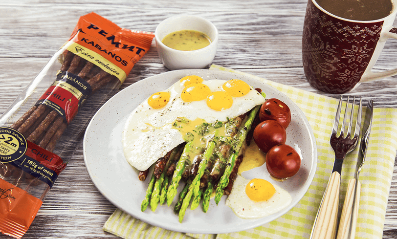Завтрак в выходные должен быть особенным. Согласны? Острые колбаски и глазунья из перепелиных яиц отлично сочетаются с жаренными помидорами и спаржей. Добавь пикантный соус на основе пряных трав, оливковое масло и дижонскую горчицу. Да, такой завтрак быстро не забудешь!