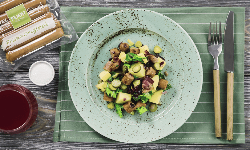 Этот теплый салат 100% понравится любителям мяса. Готовится легко и быстро. Обжаренные колбаски и грудинка задают общий тон всему блюду, а кисло-сладкие нотки винного уксуса в соусе и вареный картофель завершают волшебство.