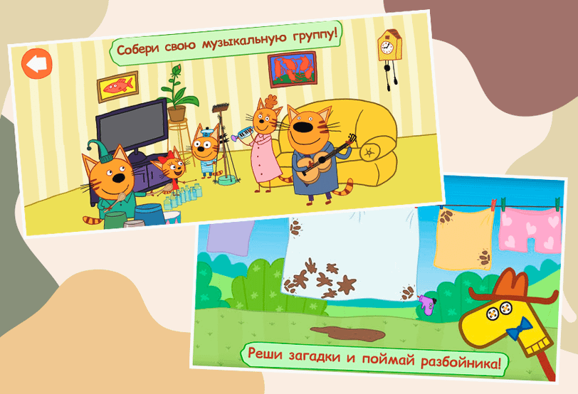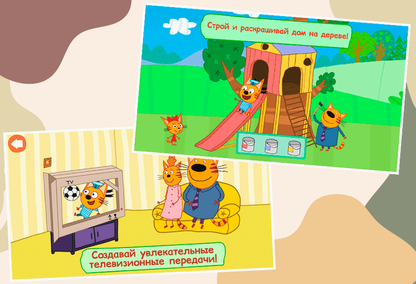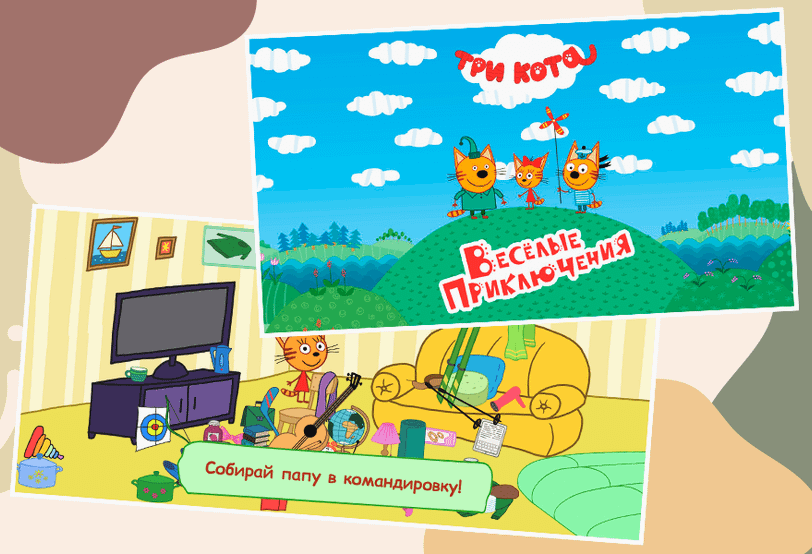 Приложение предназначено для детей от трех лет. Оно поможет обуздать неуемную любовь ребенка к гаджетам и направить ее в правильное русло. В центре сюжета — кошачья семья, но играть можно только тремя персонажами: Компотом — самым старшим котенком в зеленом костюме, Коржиком, который чуть младше и одет в форму моряка, и Карамелькой — забавной кошечкой в красном платье и с большим красным бантом. Ребенок должен помогать им выполнять разные задания.