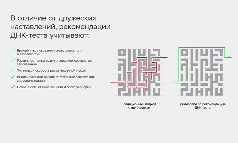 Мы привыкли думать, что регулярность тренировок пропорциональна качеству конечных результатов. Несмотря на то, что в этом есть доля правды, на самом деле генетическая предрасположенность оказывает гораздо большее влияние на твой спортивный успех. ДНК-тест позволит определить подходящий тебе вид спорта, исходя из твоих врожденных показателей силы, скорости и выносливости, особенностей обмена веществ и расхода энергии. Ты узнаешь, как можно оптимизировать свои тренировки, чтобы достичь лучших результатов за максимально короткий период, – набрать мышечную массу или сбросить лишние килограммы — и по возможности избежать спортивных травм.