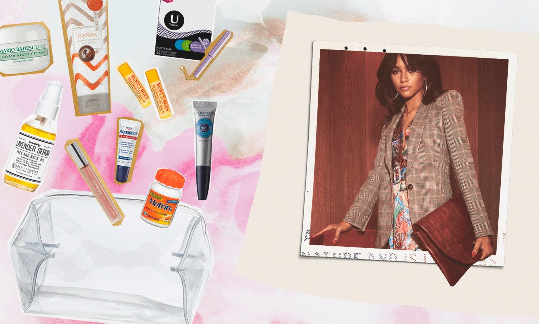 Полная косметичка декоративных средств, включая тушь, два вида хайлайтеров и блески для губ, а также контейнер со здоровыми перекусами — идеальный выбор для того, чтобы всегда быть готовой к долгому рабочему дню.