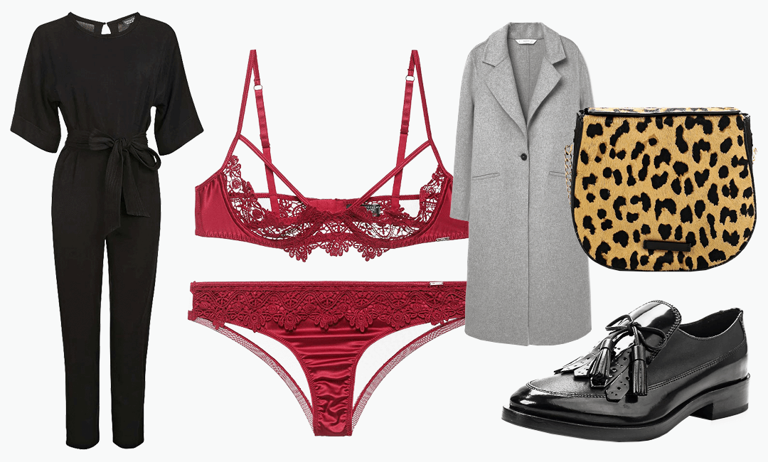 Если вы предпочитаете более темные или сдержанные цвета в гардеробе, то красный может легко подчеркнуть вашу сексуальность и загадочность, если надеть его под одежду. Красное нижнее белье — идеальное решение для тех, кто собирается насладиться праздником на всех возможных уровнях. Повседневный, но элегантный образ можно создать, надев комбинезон или классические брюки с блузкой, сдержанные лоферы, а сумку с леопардовым принтом использовать как яркий акцент.