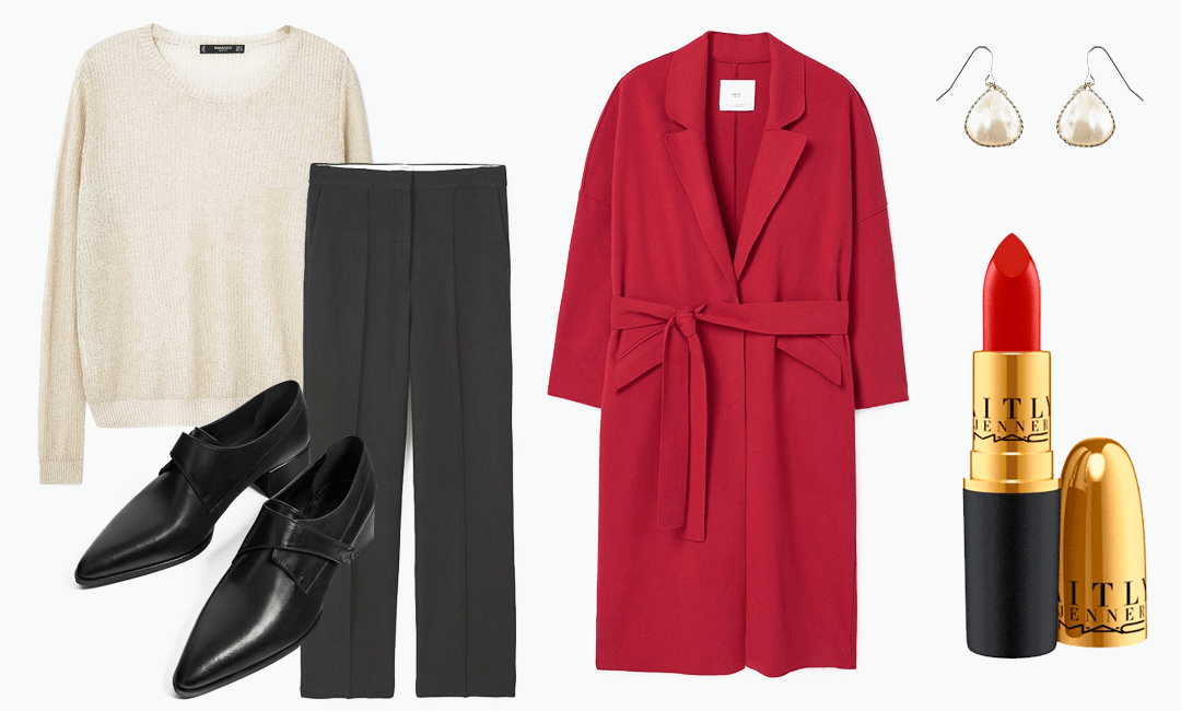 Даже в повседневной и комфортной одежде можно выглядеть женственно и сексуально в праздничный день. Если вы отдаете предпочтение скорее классическим брюкам, чем облегающему платью, то данный образ — для вас. Классические брюки, широкие, узкие и расклешенные в сочетании с тонким джемпером пастельного оттенка и строгих, но стильных туфлей могут выглядеть очень романтично и женственно. Чтобы добавить яркий и самоутверждающий акцент вашему образу, используйте пальто или любую другую верхнюю одежду красного цвета.