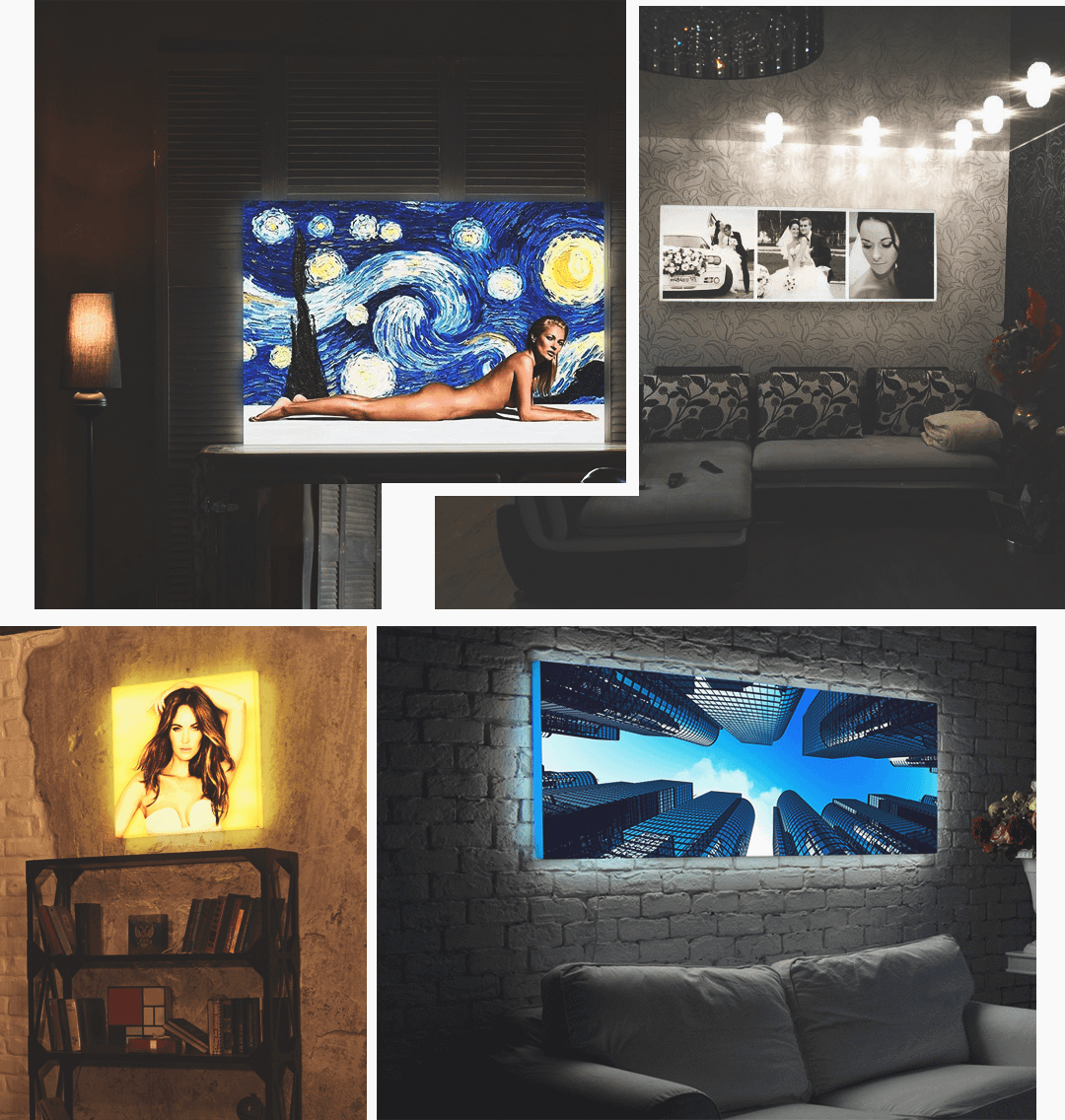 Фото-светильник – это объемный светодиодный короб, на который крепится постер с фотографией. Его можно повесить на стену, поставить на пол или другую поверхность. Постер сменный, так что есть возможность выбирать картины по настроению.