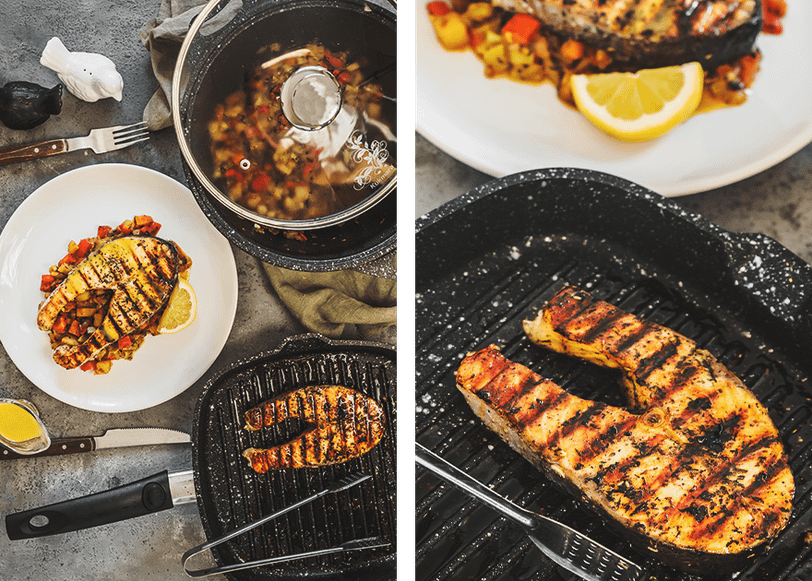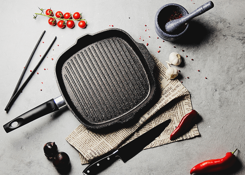 Износостойкая сковорода-гриль от Kukmara позволяет не добавлять в блюда масло, ведь при жарке в бороздки между выступами проникают естественные соки, которые делают еду ароматной и сочной.