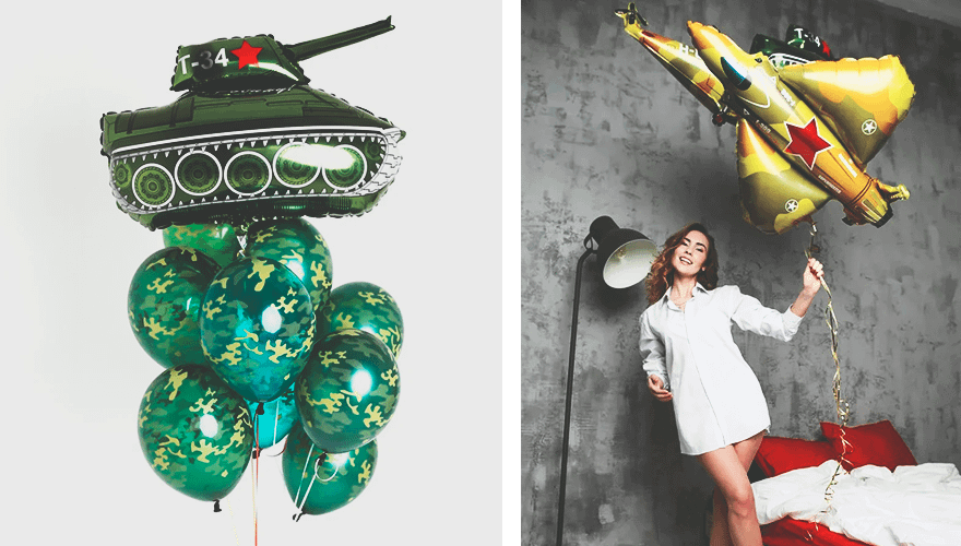 Воздушные шары — простой, но не скучный способ поддержать атмосферу праздника. Есть два варианта, как это сделать: украсить шарами интерьер или сделать их дополнением к основному подарку. Например, можно заказать камуфляжный фонтан с большим фольгированным шаром в виде танка и украсить офис, чтобы порадовать коллег.