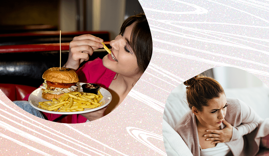 Переедание также может привести к тому, что содержимое желудка будет подниматься обратно в пищевод и забрасываться в горло. Это происходит потому, что нижние мышцы желудка, которые открываются и закрываются, чтобы пропускать пищу, перестают нормально работать.