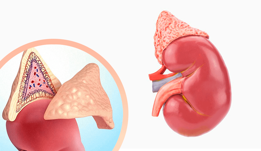 Надпочечники — это парные эндокринные железы, которые вырабатывают гормоны и биологически активные вещества. Каждая железа находится прямо над почкой и состоит из мозгового вещества и коры — самой большой части железы.
