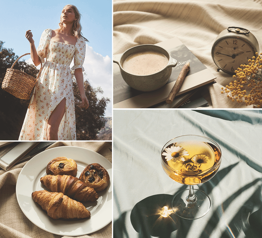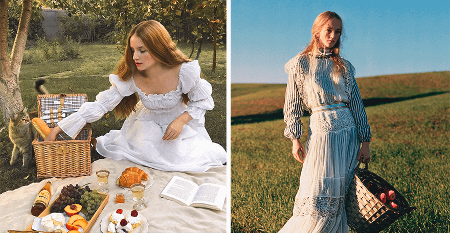 Пикник — один из главных сюжетов сottagecore. Перекус на природе часто состоит из фруктов, круассанов и вина, уложенных в плетеную корзину, иногда образ дополнен чаем из красивого сервиза или ярким десертом.