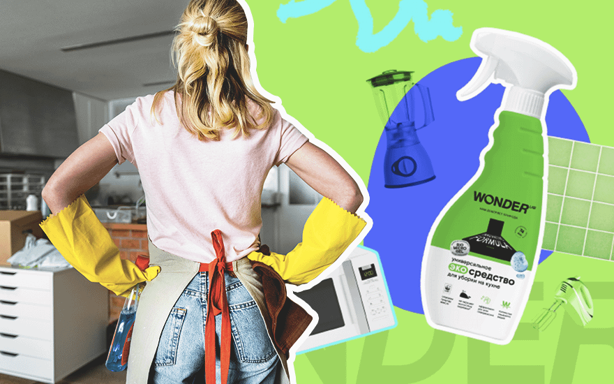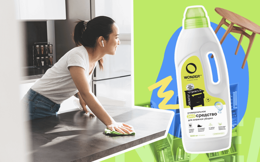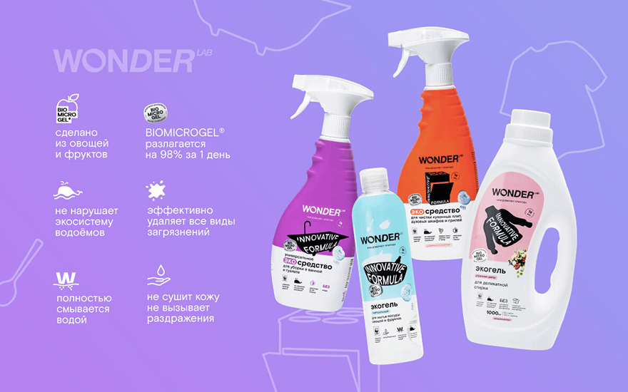 Эффективные и безопасные экосредства для уборки есть у WONDER LAВ. Для производства бытовой химии бренд использует инновационный биомикрогель на основе яблок, кукурузы и свеклы, который разлагается на 98% за 24 часа, а также натуральные ПАВ из кокосового масла. Фосфаты, хлор, искусственные ПАВы и другие токсичные средства в ее составе исключены, а, значит, можно не опасаться за собственное здоровье.