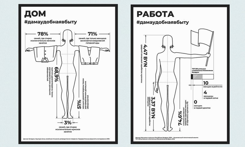 - «Инструкции» – представление статистики по социальному и экономическому положению женщин в Беларуси. Например, процент женщин на руководящих должностях – всего 9,6% против 90,4% мужских