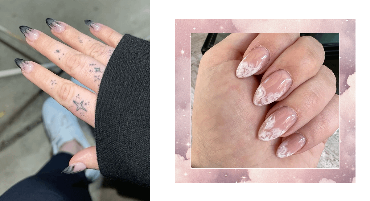 Такой дизайн выглядит особенно красиво на миндальной или овальной форме ногтей. Чтобы сделать маникюр еще эффектнее, попробуй слегка растушевать границу между базой и дымчатым кончиком — это придаст ногтям плавности и утонченности.