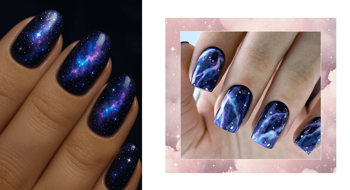 Создай эффект ночного неба или космоса, используя глубокие синие, фиолетовые и черные дымчатые оттенки. Добавь мелкие блестки или глиттер как звездочки, а несколько акцентных ногтей можно оформить мерцающими втирками, создавая иллюзию планет и галактик.