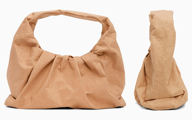 Сама сумка сделана из крафтовой бумаги, а внутренняя отделка — из телячьей кожи. Продукт на 100 % подлежит переработке.