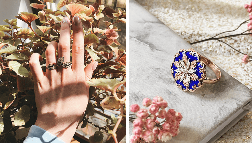 Горячая эмаль — это тонкий слой стекла, который получается посредством нанесения пудры стеклянного порошка на поверхность металла, будь то золото или серебро, и последующего плавления его в печи при температуре 800–870 градусов, после чего происходит сцепление расплавленного стекла с драгоценной основой. Ты можешь быть уверена в долговечности изделий с горячей эмалью, потому что украшения, созданные в технике горячей эмали, известны со времен Древнего Египта, и они дошли до нас такими же яркими, будто были сделаны в наши дни.