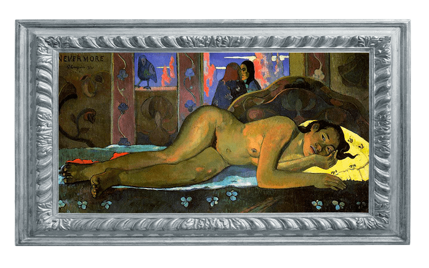 Самого художника сейчас считают не самым хорошим человеком: он притеснял таитянок и спал с несовершеннолетними девушками. Однако к его работам невозможно относиться равнодушно — они либо завораживают и привлекают внимание, либо заставляют спорить о природе искусства. На полотне «Больше никогда» Гоген изобразил девушку, которая притворяется спящей и с тревогой подслушивает разговор персон, расположенных на дальнем плане. Один из главных элементов — птица у окна, заставляющая проводить параллели с одноименной поэмой Эдгара По.