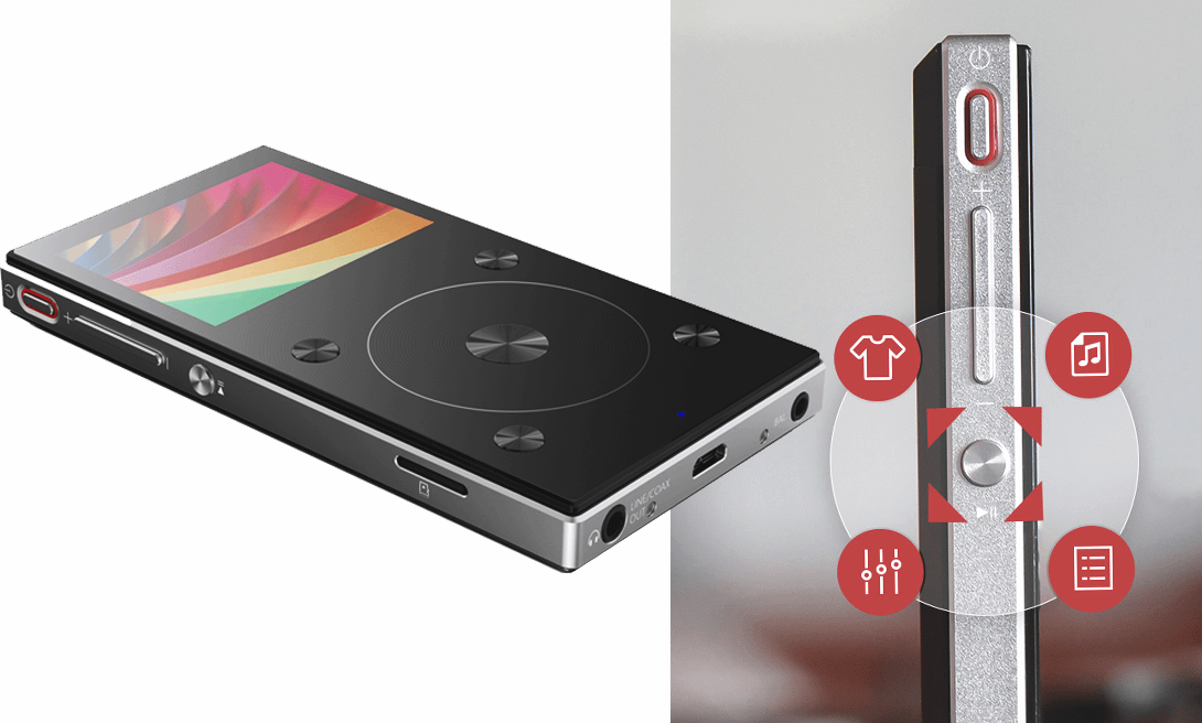 FiiO X3 III имеет небольшой экран с разрешением 320×240, кстати, не сенсорный, и механическое управление. Помнишь, как приходилось рыться в сумочке в поисках смартфона или доставать его из кармана, попутно роняя всё содержимое? Так вот, здесь такого не будет. Управление минималистичное и осуществляется всего одной многофункциональной кнопкой на правой грани, рядом с клавишей регулировки громкости. На передней панели также находится несколько кнопок управления, и, что больше всего понравилось и вызвало ассоциации с классическими версиями айподов — сенсорное колесо прокрутки по центру. Если честно, мы считаем, что вместо сенсорного колеса было бы круче, если бы производитель установил механическое, с таким же приятным «похрустыванием», как у старых iPod Classic.