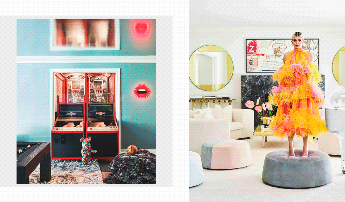 В доме много блеска и уютной голливудской роскоши, о чем свидетельствуют не только позолоченный потолок в столовой и винтажная мебель, но и большинство предметов искусства: работы Дэмьена Херста из серии I Love You, цветные принты Энди Уорхола с изображением Мэрилин Монро, черно-белые фотографии Одри Хепберн, Брижит Бардо и Твигги и неоновая скульптура Трейси Эмин.