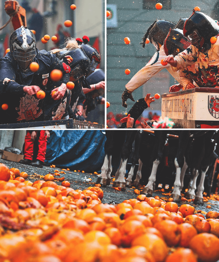 Очаровательный итальянский городок Ивреа в области Пьемонт вряд ли когда-нибудь заметили бы туристы, если бы не Carnevale di Ivrea — самый крупный продовольственный фестиваль Италии. На несколько дней отдельные части города превращаются в места сражений, где главное оружие – апельсины. Девять команд забрасывают ими повозки с людьми в защитной амуниции, олицетворяющих стражников герцога.