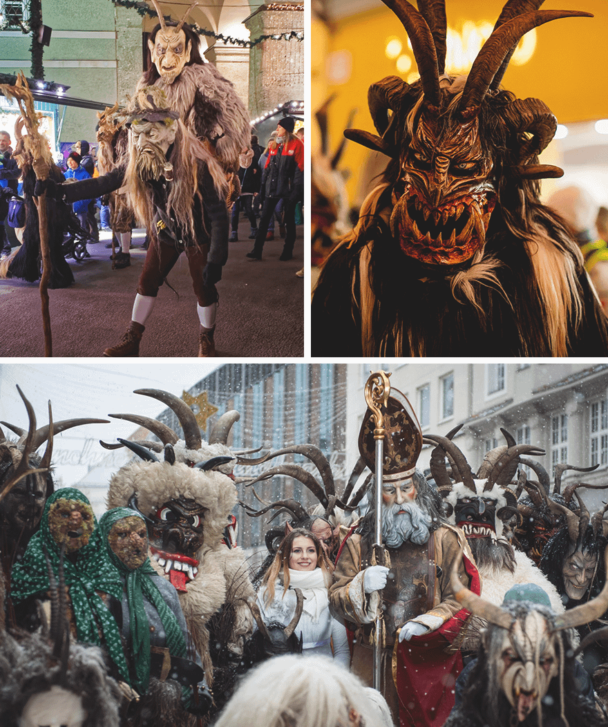 Во время парада Крампуса 6 декабря, горожане наряжаются в жуткие костюмы – маски с рогами, волосатые шкуры, коровьи колокольчики. Они толпами бродят по улицам, вооружившись березовыми прутьями и горящими факелами, и пугают друг друга и прохожих. Настроение жуткое, но все же рождественское.