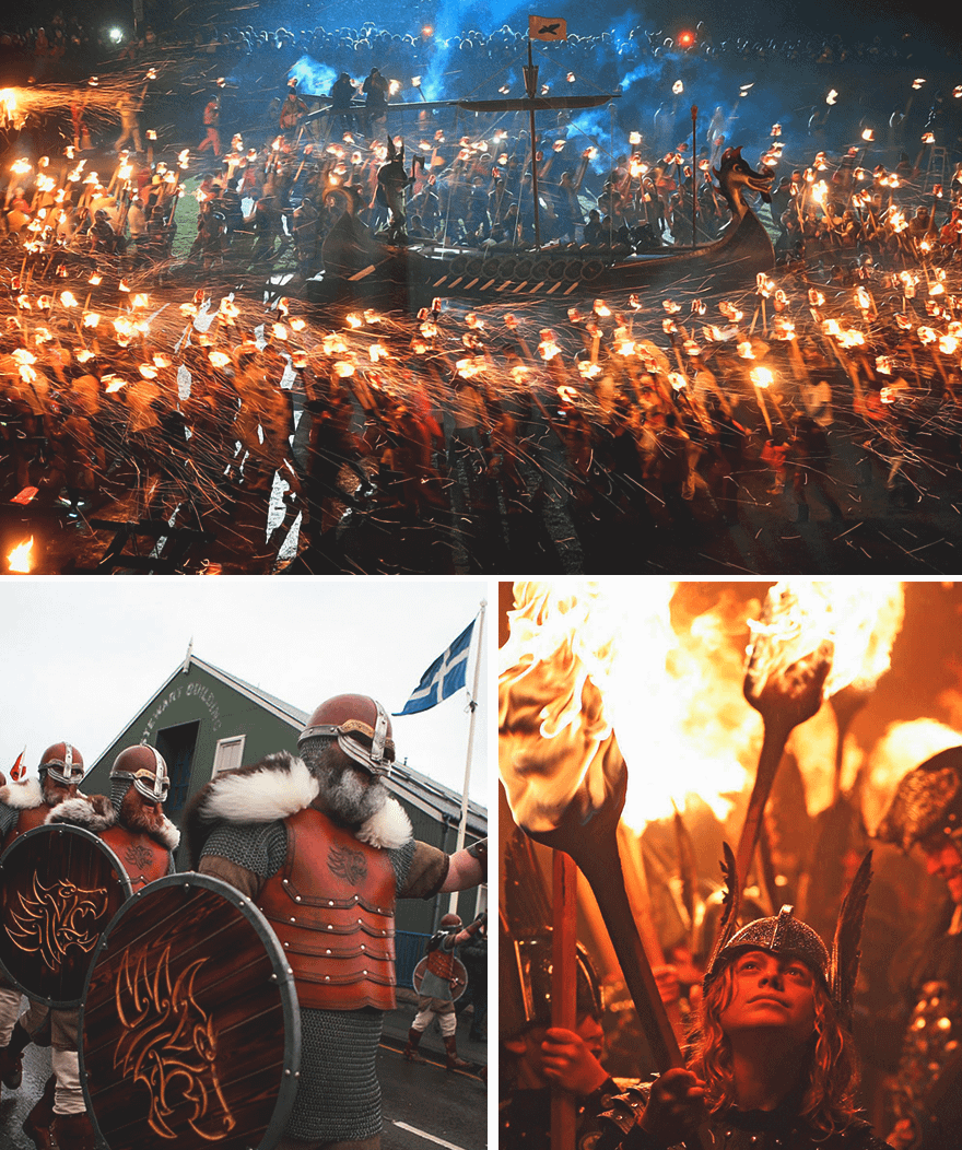 Праздник Up Helly Aa, который ежегодно проходит в Шетландских островах в Шотландии, вырос из старой йольской рождественской традиции. В 19 веке молодые люди, напившись горячительных напитков, таскали по городу на санях бочки с горящей смолой и устраивали разные шалости, вдохновившись развлечениями древних викингов.